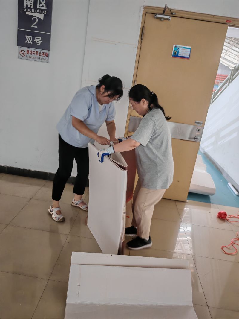 物業(yè)公司黨員干部及職工在館內(nèi)酷熱的環(huán)境下,積極投入清掃工作中,分工合作,有的負(fù)責(zé)摘除過期廣告牌、有的負(fù)責(zé)清運(yùn)廣告牌、有的負(fù)責(zé)鏟除墻體雙面膠、有的負(fù)責(zé)清理平臺衛(wèi)生、有的負(fù)責(zé)粘貼區(qū)域標(biāo)志,嚴(yán)格實(shí)行不間斷的巡回式清理,不放過任何一處衛(wèi)生死角。經(jīng)過大家一上午的努力,體育館內(nèi)部環(huán)境煥然一新。