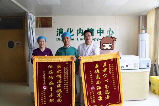 5月28日上午,46歲的張女士踏入大屯煤電公司中心醫(yī)院的胃鏡室,親手將兩面熠熠生輝的錦旗分別遞給了李學(xué)勇和張士兩位醫(yī)生。她緊緊握住醫(yī)生們的手,滿懷感激地連聲說道:“謝謝!謝謝你們兩位,還有你們的團(tuán)隊!我真是太幸運了,能遇到你們,在做胃腸鏡檢查時及時發(fā)現(xiàn)早期病變,使我及時做了手術(shù)?!?