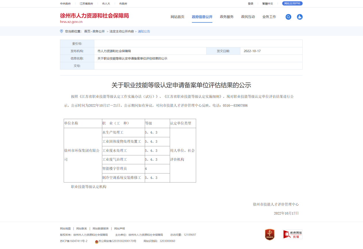 近日,江蘇技能人才評價(jià)服務(wù)網(wǎng)公布了職業(yè)技能等級認(rèn)定機(jī)構(gòu)(面向社會(huì))名單,徐州市環(huán)保集團(tuán)評價(jià)中心作為徐州市本級職業(yè)技能等級認(rèn)定機(jī)構(gòu)位列其中,公示備案職業(yè)(工種)和等級為水生產(chǎn)處理工:5、4、3;工業(yè)固體廢物處理處置工:5、4、3;工業(yè)廢水處理工:5、4、3;工業(yè)廢氣治理工:5、4、3;智能樓宇管理員:4;制冷空調(diào)系統(tǒng)安裝維修工:5、4、3。