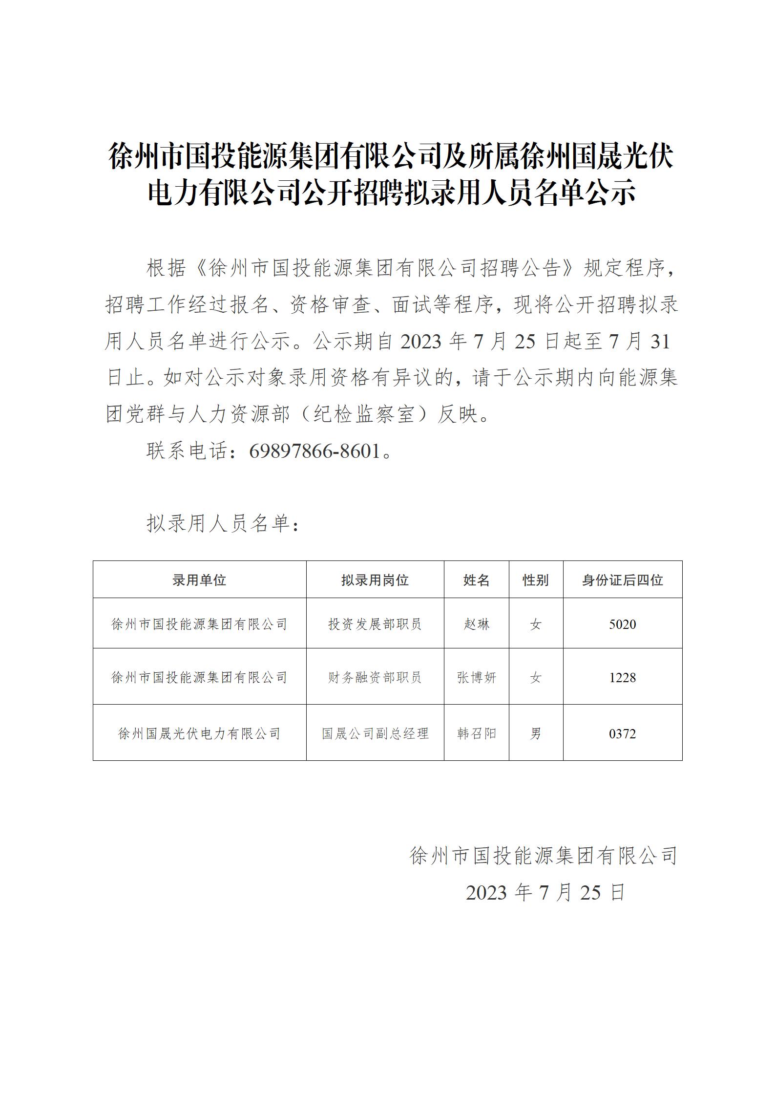 徐州市國投能源集團(tuán)有限公司及所屬徐州國晟光伏電力有限公司公開招聘擬錄用人員名單公示