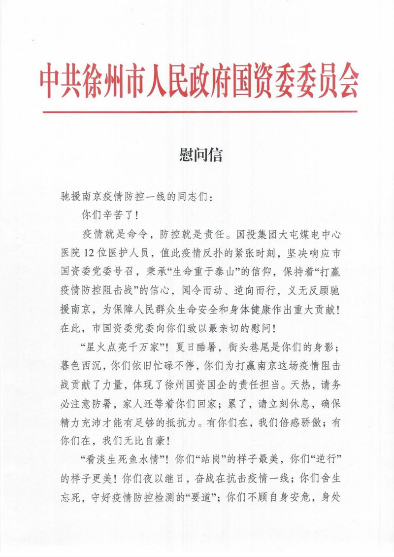 市國(guó)資委向馳援南京新冠疫情防控一線的徐州國(guó)投大屯煤電中心醫(yī)院的同志致慰問信