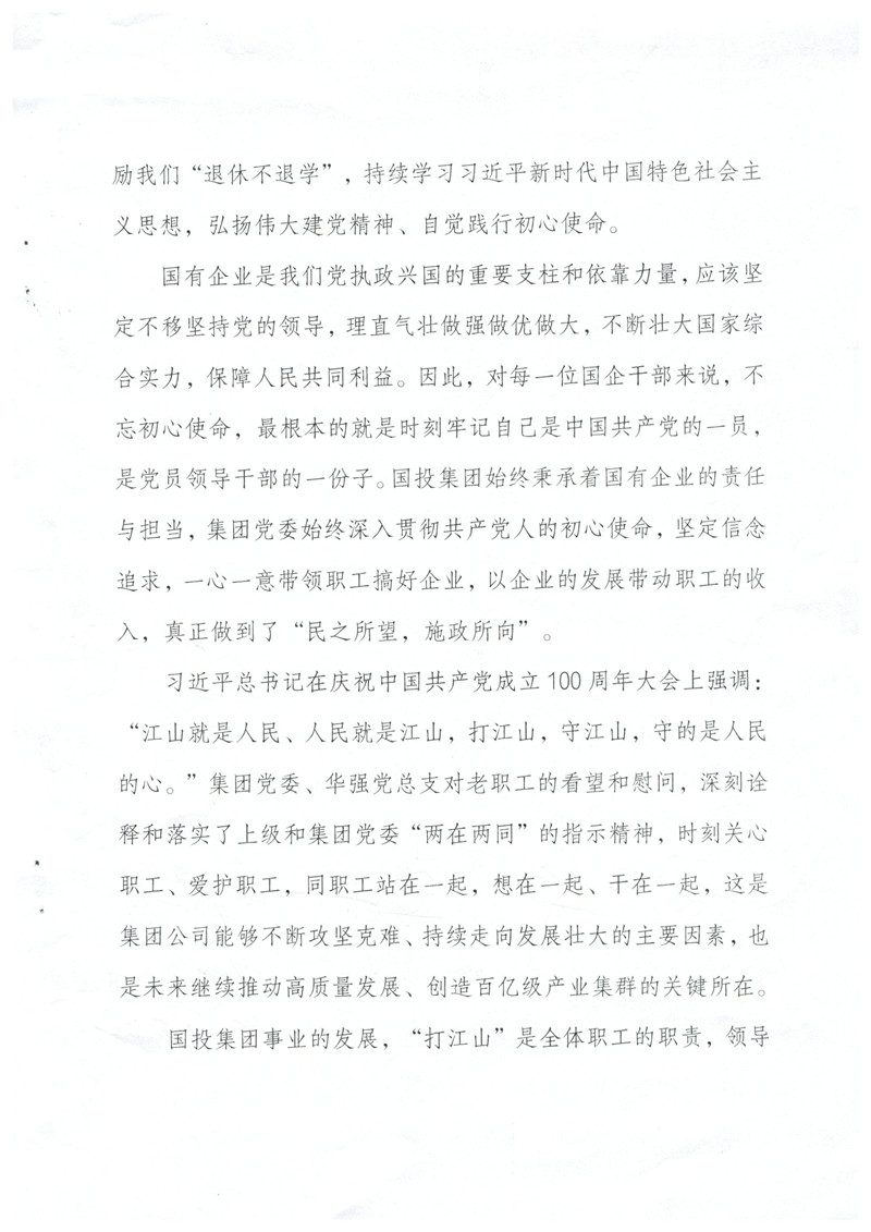 您們好!來(lái)信收悉。在中秋佳節(jié)之后,國(guó)慶即將來(lái)臨之時(shí),收到老同志們的來(lái)信,倍感親切,老同志們退休不退出,一直關(guān)心支持國(guó)投集團(tuán)改革發(fā)展情況并積極建言獻(xiàn)策的精神讓我們感動(dòng),正是由于像您們一樣的徐州國(guó)投老同志們的無(wú)私奉獻(xiàn)和精神感召,全集團(tuán)2000余名在崗職工勤勉履職,愛(ài)崗敬業(yè),開(kāi)創(chuàng)了徐州國(guó)投來(lái)之不易的發(fā)展成績(jī),我們表示非常感謝,并向您們和國(guó)投集團(tuán)全體退休老同志致以誠(chéng)摯的問(wèn)候!