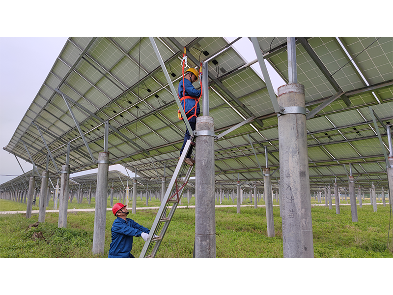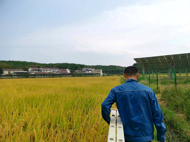 太湖鑫能電站位于安慶山區(qū),總裝機容量2萬千瓦,占地面積647畝,分別在三個不同地方,區(qū)域跨度大、道路條件差,有些光伏區(qū)甚至無法通車,只能攜帶沉甸甸的維修設備徒步前行,身體和設備維修都面臨著極大考驗。10月1日上午11時,驕陽似火,“秋老虎”的回歸使氣溫重返36度。電站班長謝文理帶領巡檢人員走在狹窄的田埂上,厚重的工作服下早已滲滿了汗水,他們已經(jīng)徒步巡檢了3公里的線路,走在最前面的謝文理在匯報完工作進度后,轉(zhuǎn)頭對同行人員說“12點前必須把這個區(qū)域仔細巡檢一遍,下午再去剩下的區(qū)域”。說著他加快了腳步,一行人在泥濘的地面上留下了一串串深深的腳印。