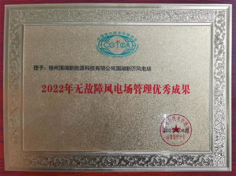 8月24日,徐州國湖新能源科技有限公司所屬國湖新沂風(fēng)電場榮獲中國電力技術(shù)市場協(xié)會頒發(fā)的“2022年無故障風(fēng)電場管理優(yōu)秀成果”獎項。