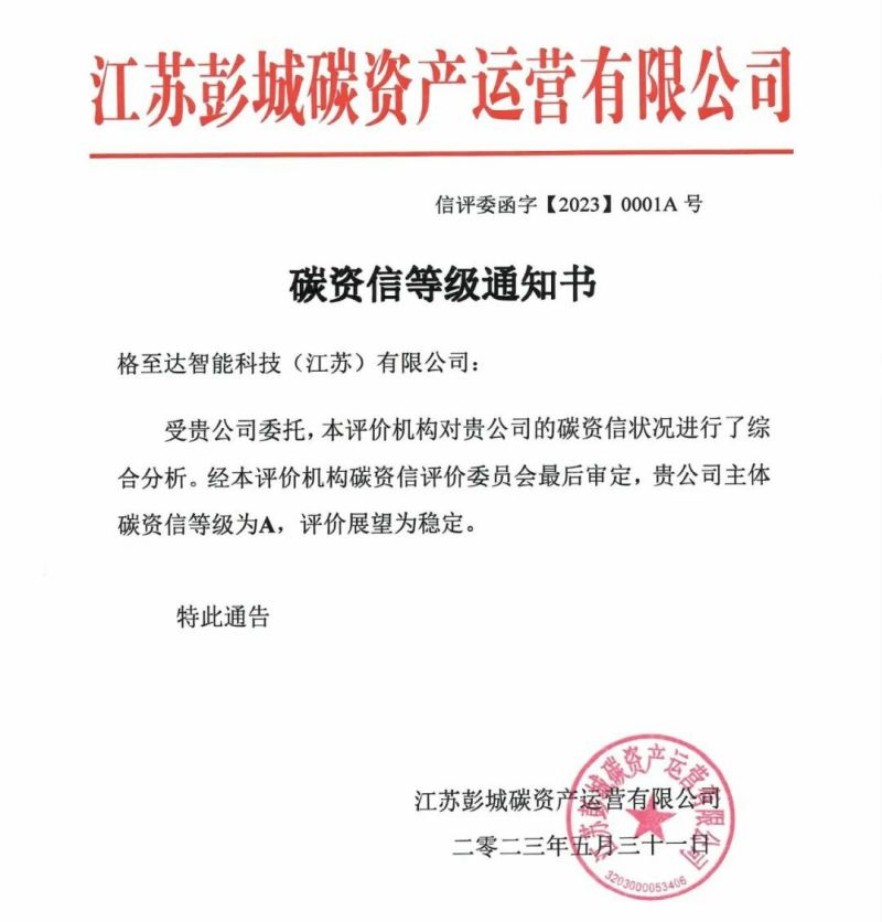 12月8日,在江蘇省新型能源體系示范啟動暨徐州市綠色低碳能源產(chǎn)業(yè)發(fā)展推進大會上,江蘇銀行徐州分行、格雷博智能動力、徐州國投集團共同簽署了格至達綠色貸款項目,簽署完走下臺的格至達智能科技(江蘇)有限公司副總經(jīng)理鄧昇,迫不及待地向記者展示了全市首張企業(yè)碳資信等級證書,“0001A”號!