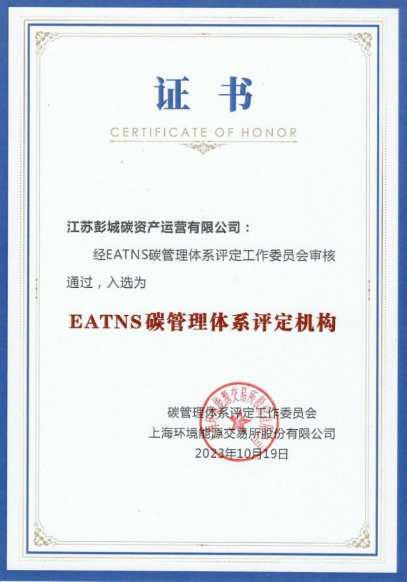 今年10月,江蘇彭城碳資產(chǎn)運營有限公司經(jīng)EATNS碳管理體系評定工作委員會審核通過,入選EATNS碳管理體系評定機構(gòu),這是全國能開展碳資信評價的九家團隊之一。