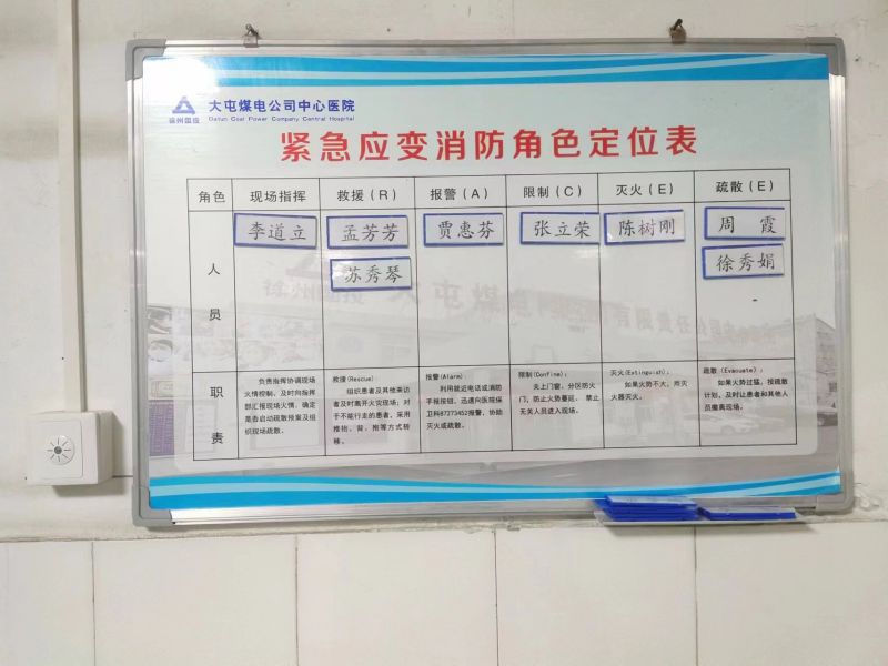 為明確各級(jí)崗位人員火災(zāi)救援分工職責(zé),建立火災(zāi)快速響應(yīng)機(jī)制,大屯公司中心醫(yī)院在學(xué)習(xí)總結(jié)先進(jìn)工作經(jīng)驗(yàn)的基礎(chǔ)上,結(jié)合實(shí)際情況,設(shè)立了“科室火災(zāi)角色定位分工展示牌”,以明確在班職工的消防角色定位,提高職工的消防滅火和應(yīng)急疏散能力。