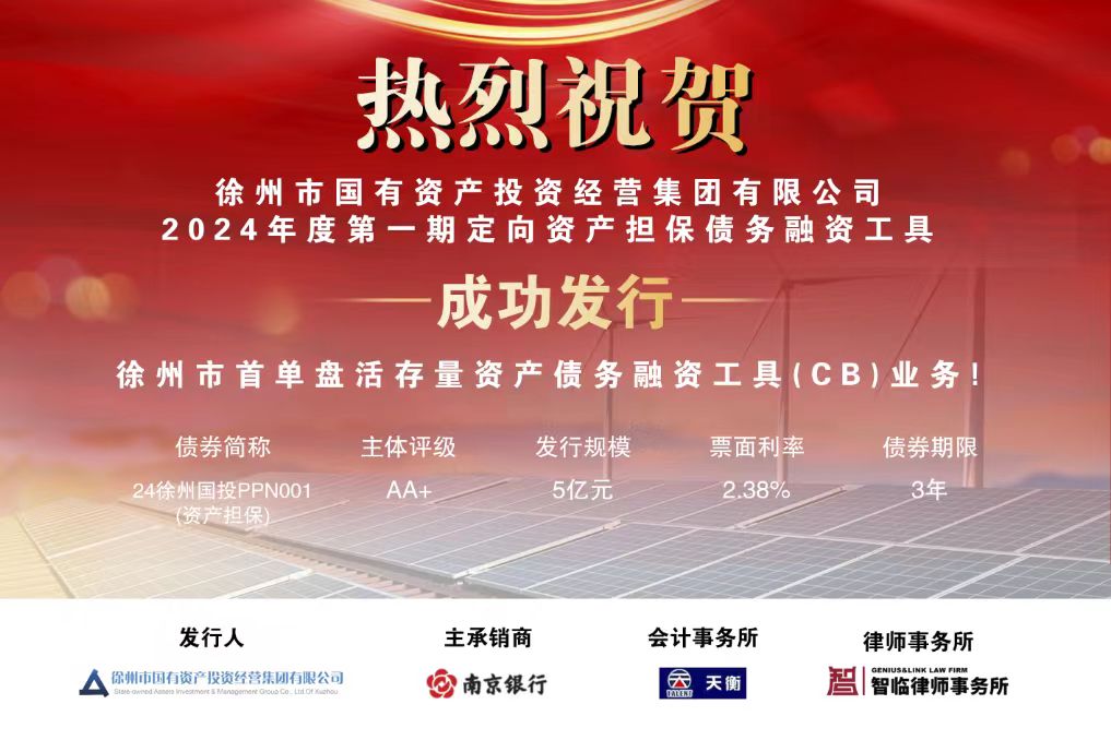 近期,徐州市國有資產(chǎn)投資經(jīng)營集團(tuán)有限公司(簡稱“徐州國投集團(tuán)”)2024年度第一期定向資產(chǎn)擔(dān)保債務(wù)融資工具成功發(fā)行,規(guī)模5億元,期限3年,票面利率2.38%。