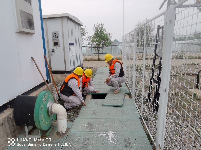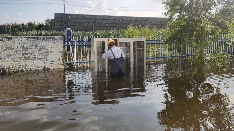 雨勢越來越猛,積水也越積越多,同時電站外面的積水也在向內(nèi)倒灌,遠遠望去,站內(nèi)的積水和周邊村莊田地連成一片汪洋。劉忠保看著積水高度的逐步上漲,先是淹到了腳踝,后來是空調(diào)外機,眼瞅著已經(jīng)到了控制室和設(shè)備艙的臺階處,“于紀瑤,你跟我一起去查看積水情況!”兩人合力將地板掀開,看到下面已經(jīng)是積水?!?0公分,再升高10公分,設(shè)備就會產(chǎn)生巨大損壞,也會造成短路風(fēng)險”劉忠保心里盤算著,“可是現(xiàn)在拉閘,發(fā)電量也會造成損失?!彼才烹娬救藛T白天全員在崗、夜間輪換值班,通過24小時不間斷值守對站內(nèi)重要設(shè)施進行高頻率水位監(jiān)視,密切關(guān)注電纜溝水位與高壓開關(guān)柜底部距離、接地變附近水位以及一次、二次室內(nèi)部濕度情況,力爭撐到最后的安全線再拉閘,將損失降到最低。