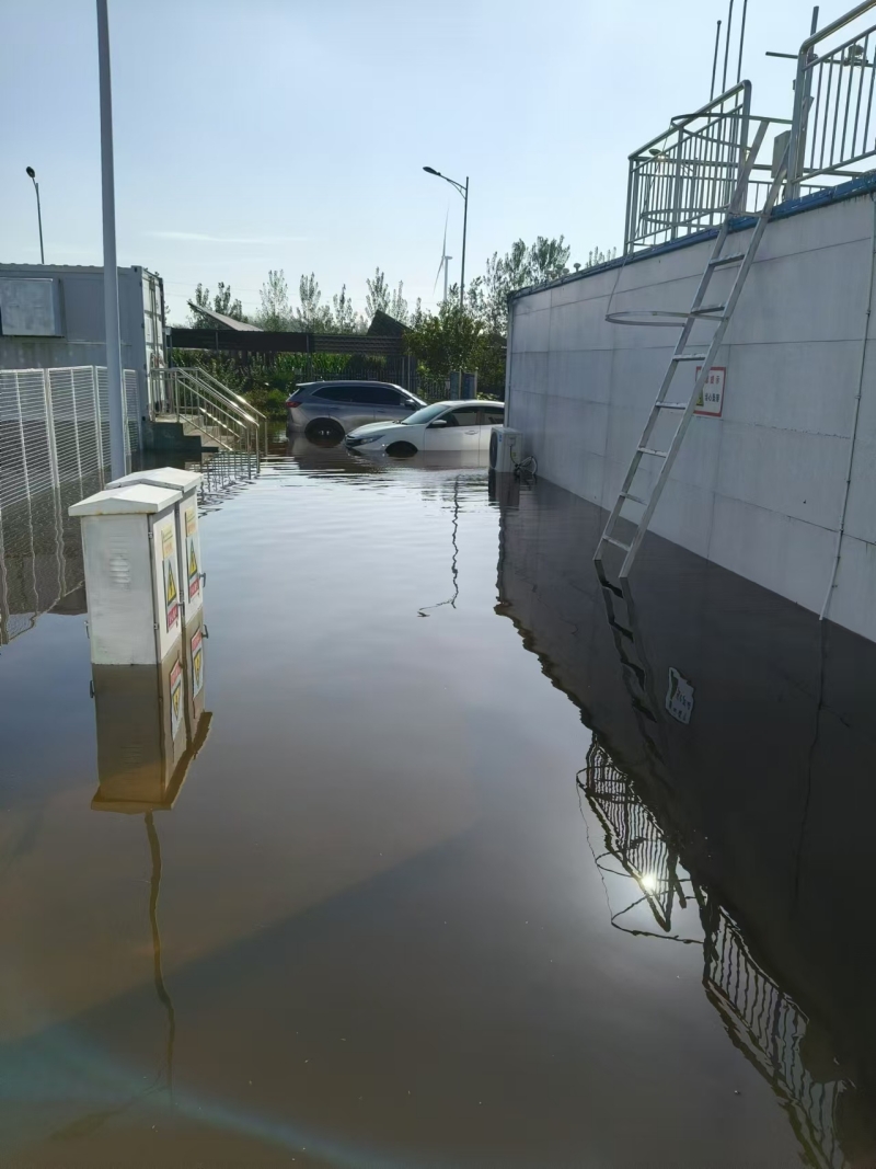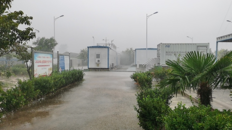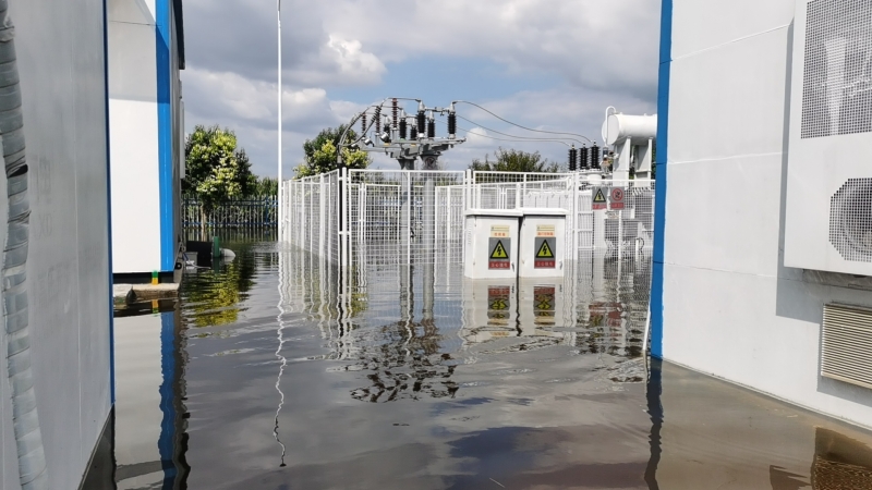 狂風(fēng)暴雨自9月17日12點來襲,由于碭山鑫能電站所處地勢低洼,很快形成積水。電站人員首先切斷了電動門、生活水泵、電纜溝風(fēng)機等設(shè)備電源,防止因進水短路可能引發(fā)的安全事故;將400V低壓ATS電源由常用模式切換至備用模式,并將35KV站用接地變514開關(guān)由運行轉(zhuǎn)冷備用,防止因水位上升對設(shè)備的影響。