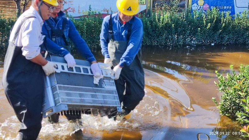 9月19日02時57分,暴雨黃色預(yù)警信號解除,面對一片狼藉的現(xiàn)場,全體員工沒有絲毫懈怠,迅速從抗洪搶險模式轉(zhuǎn)入查驗設(shè)備運行狀況與恢復(fù)廠容廠貌階段?!爸煊瘢s緊采購下水褲、烘干機、消毒液?!眲⒅冶榉乐褂旰蟠紊鸀?zāi)害、加快設(shè)備檢查與恢復(fù)進程,迅速做出工作安排,對受損物資進行全面、精準地統(tǒng)計,詳細記錄受損程度和原因,向保險公司提交詳盡的理賠材料。經(jīng)統(tǒng)計,除3臺逆變器、1臺柜式空調(diào)、1扇電動大門等設(shè)備受損外,光伏區(qū)組件、支架、電纜、箱變、逆變器、匯流箱等重要發(fā)電設(shè)備均未受損。