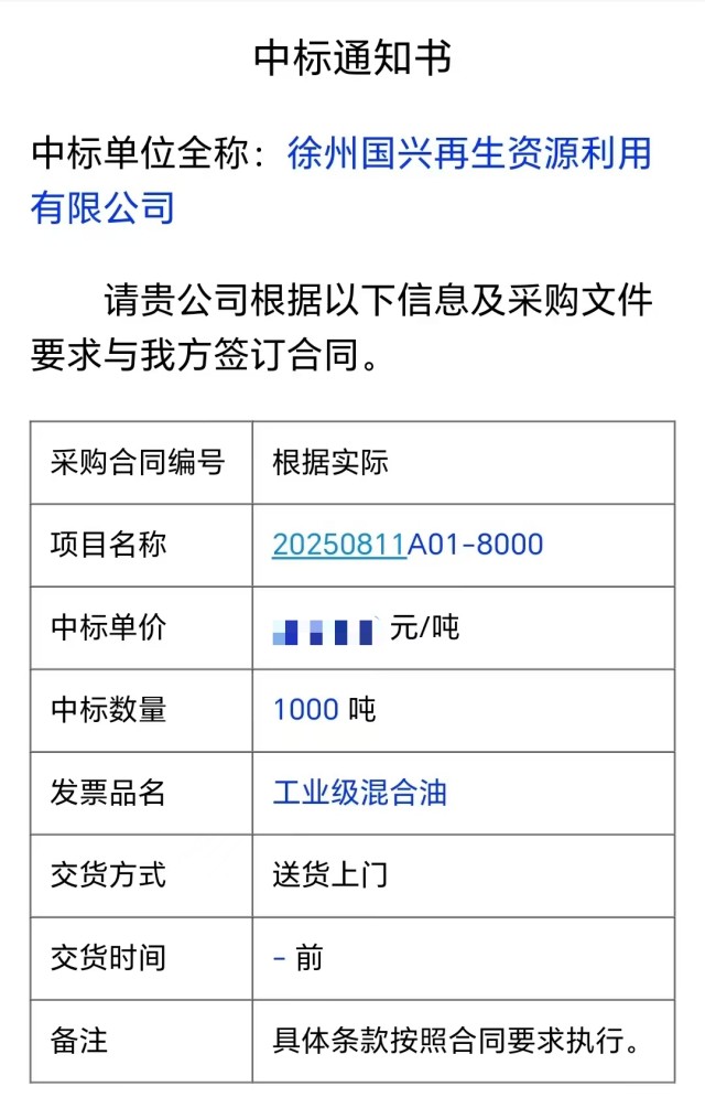 8月12日,徐州國興再生資源利用有限公司迎來重大突破——成功中標(biāo)連云港嘉澳新能源有限公司1000噸工業(yè)級混合油(UCO)采購項目(中標(biāo)編號:20250811A01-8000)。這是國興公司首次實現(xiàn)千噸級工業(yè)級混合油貿(mào)易,標(biāo)志著集團(tuán)公司在生物質(zhì)能源領(lǐng)域的市場開辟新道路,也為企業(yè)建立零碳工廠邁出堅實的一步。